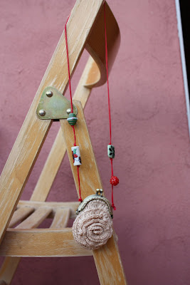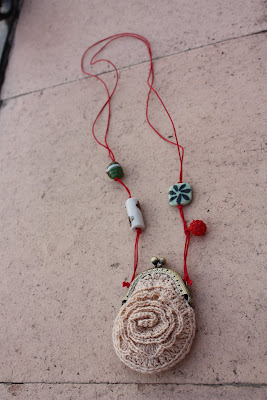 Pero no solamente van para allá dos de los pájaros, me apetecía mandar un collar de los que hago últimamente con las mini-boquillas y la tela roja con lunares blancos y los tonos verdes no podían faltar para que se notara que era de "El Cocherito Leré".